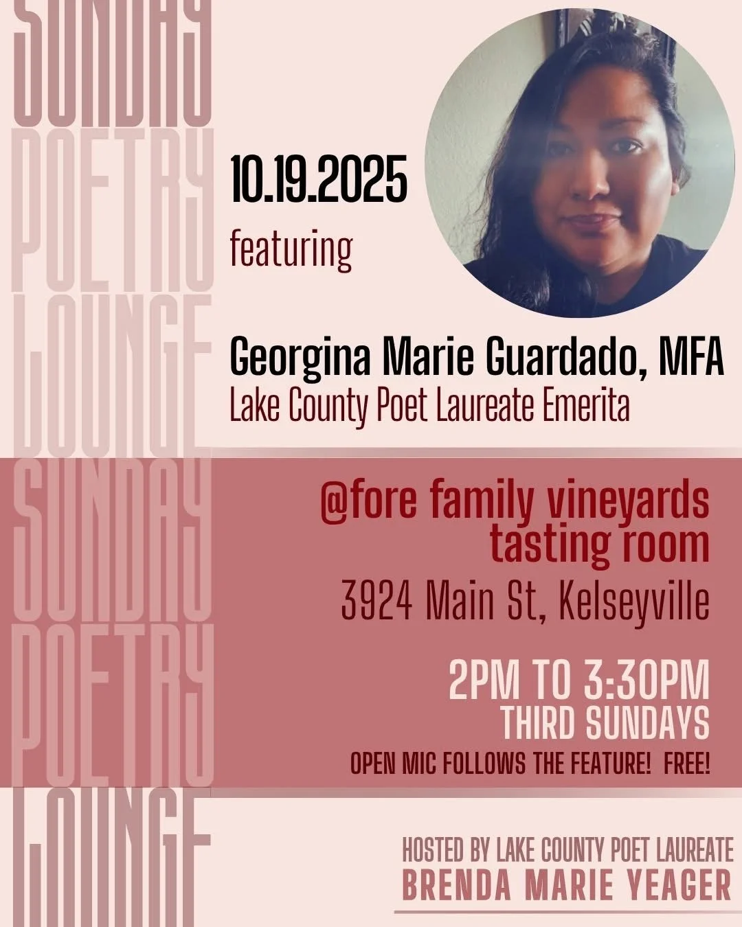 Sunday Poetry Lounge 3rd Sunday of each month beginning Sunday October 19, 2025 2-3:30 pm Fore Family Vineyards Tasting Room 3924 Main St. Kelseyville, CA 95451
